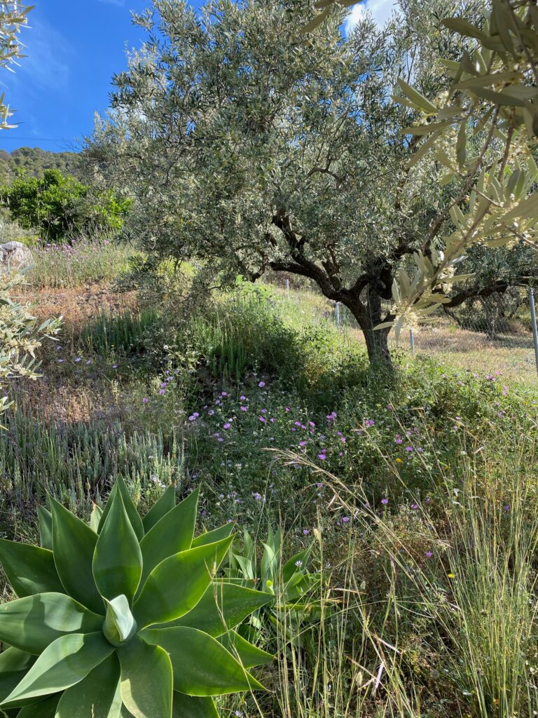 Mellem oliventræets sølvgrønne blade og den frodige vildvoksende flora udfolder naturen sig på egne præmisser. Her får urter, græsser og blomster lov til at gro frit – et lille økologisk paradis, hvor biodiversiteten trives og landskabet ånder ro og balance.