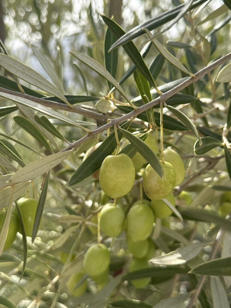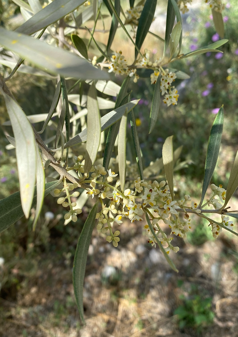 De små, lysegule blomster springer ud. De varsler livets cyklus – fra blomstens spæde løfte til den modne oliven, der langsomt fyldes med sol, næring og tidens tålmodighed.